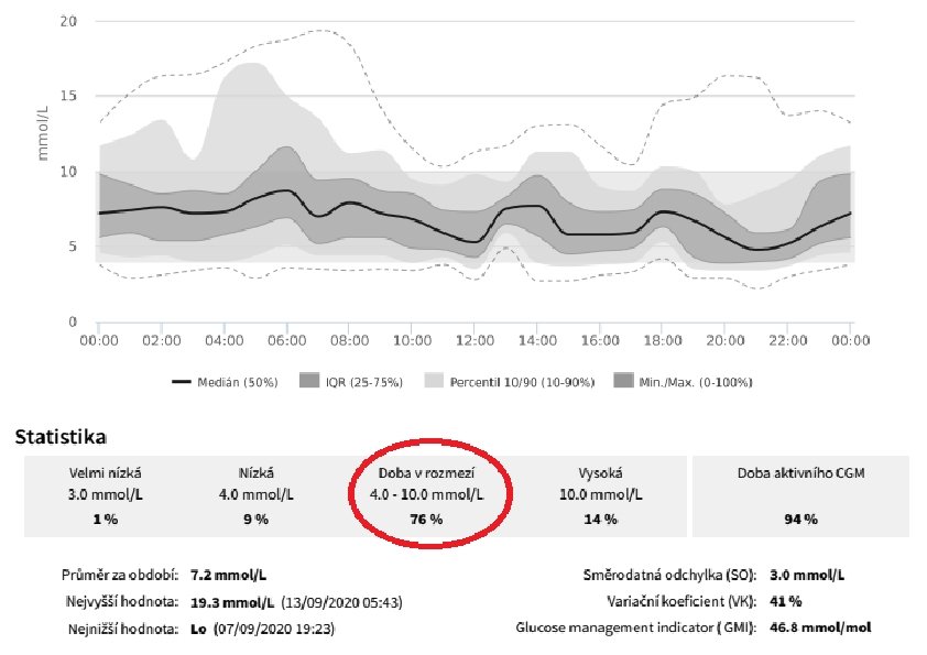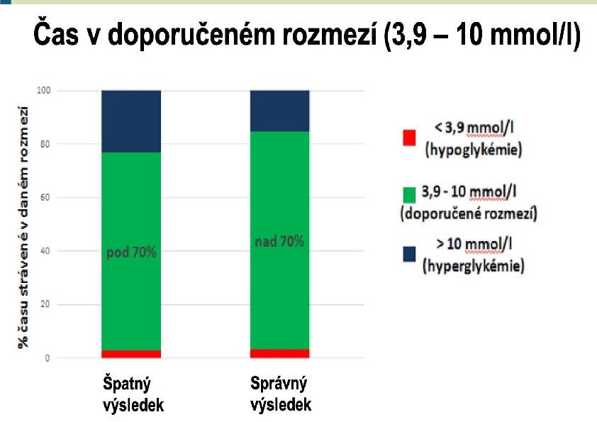 Kompenzace ● Cílový glykovaný Hb do 53 mmol/mol – všichni DM 1. typu ● Při užití CGMS – do 48 / 50 mmol/mol ● Čas strávený v cílovém rozmezí – TIR - Time In Range