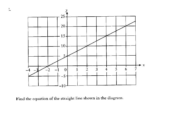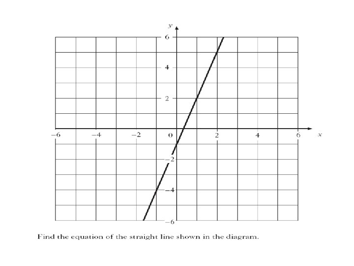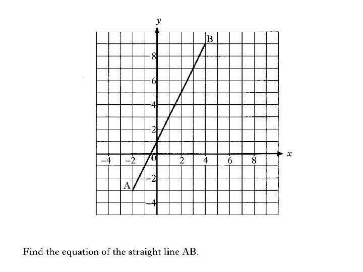 Find the equations of the straight lines below given the coordinates. y (4, 1) and (8, 5) using x y Sub (4, 1) into y = mx + c 1 = 1 x 4 + c c=1 -4 c = -3 y = x -3 10 -Nov-20 -10 (-6, 7) and (-2, 3) x y Sub (-2, 3) into y = mx + c c=3 -2 c=1 y = -x + 1 Demo
