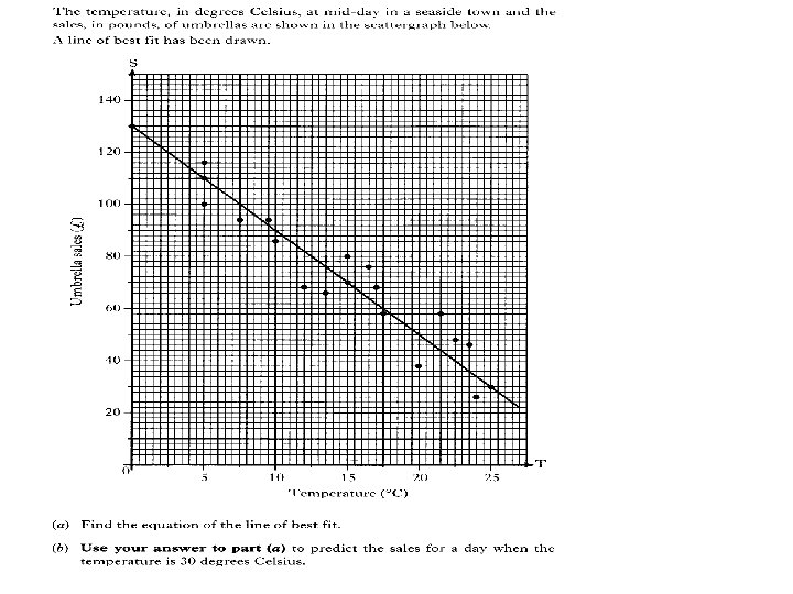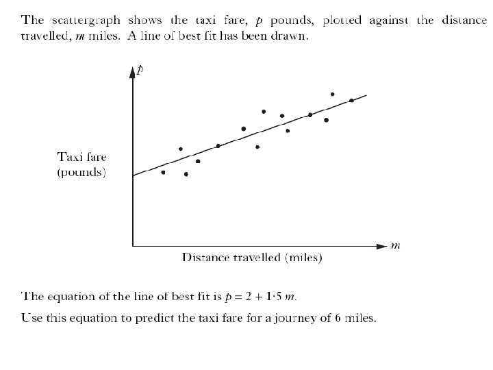 Best-Fitting Straight Line Data was collected on pupils weight and height. Data is plotted below. (b) 2. 57 c=0 h= (d) w + Height (cms) (a) Pick any Is there correlation between height and weight. 2 points Yes, a positive correlation h 200 Draw in the best-fit line and 180 x (70, 180) 160 find an equation relating 140 height and weight. 120 100 80 60 40 20 (0, 0) 0 x 10 20 30 40 50 60 70 80 90 100 Weight (Kgs) What height is a pupils who weights 40 kgs? w = 40 h = 2. 57 x 40 = 102. 8 cms w