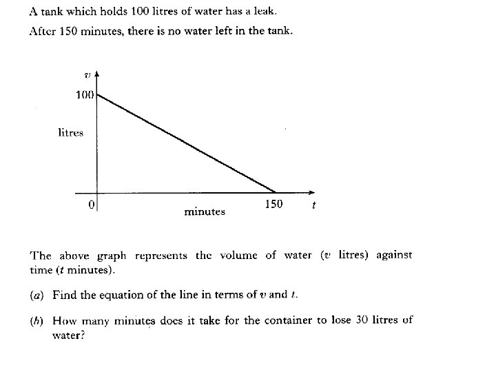 Modelling Real – life Pick any 2 points The graph shows how a the volume of water tank drains over time. -5 Calculate the gradient. (b) What is the value of V when T = 0 80 (c) Write down an equation connecting V and T. 100 (0, 80) 90 Volume (a) V 80 70 60 (8, 40) 50 40 30 20 10 V= (d) 0 T + 1 2 3 4 5 6 7 8 9 10 T Time (mins) How long before the tank is empty? V=0 0 = -5 x. T + 80 T = (-80) ÷(– 5) = 16 mins