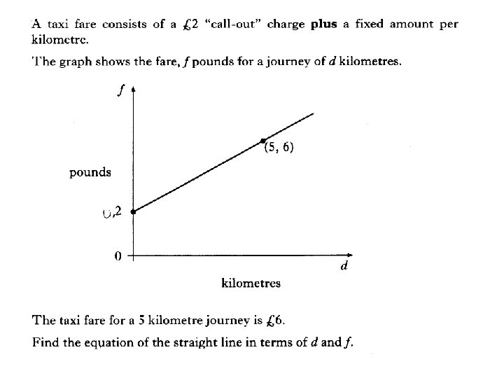 Modelling Real – life Pick any 2 points The cost for hiring a plumber per hour is shown below 10 Calculate the gradient. (b) What is the value of V when T = 0 30 (c) Write down an equation connecting V and T. 100 90 Cost £ (a) (7, 100) V 80 70 60 50 40 30 (0, 30) 20 10 V= (d) T + 0 1 2 3 4 6 7 8 9 Time (hours) Find the cost for a plumber for 10 hours? T = 10 5 C = 10 x 10 + 30 = £ 130 10 T