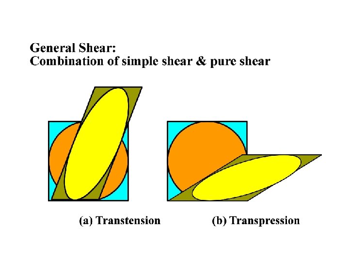 Pure Shear (note: pure means lack of rotation) • In contrast to simple shear, pure shear is a threedimensional constant-volume, irrotational, homogeneous flattening, which involves either plane strain or general strain. • Lines of particles that are parallel to the principal axes of the strain ellipsoid have the same orientation before and after deformation – It does not mean that the principal axes coincided in all increments! • During homogeneous flattening a sphere is transformed into a pancake-like shape and a box is changed into a tablet or book-like form.
