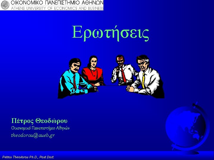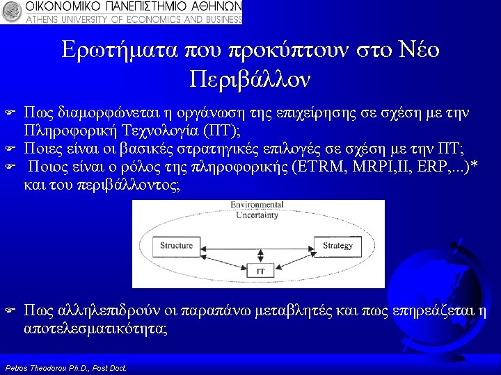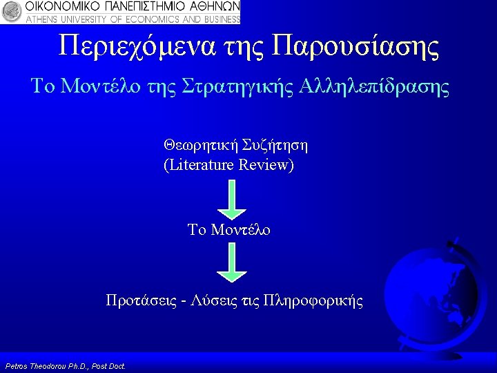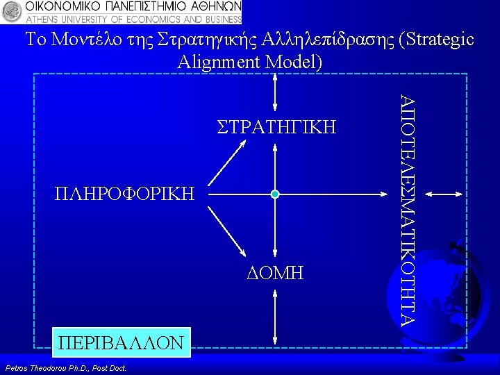 Υποδείγματα Στρατηγικού Σχεδιασμού Πληροφοριακών Συστημάτων (Strategic Alignment) Strategic Grid, Mc. Farlan & Ward Model ΜΙΤ Framework Model, S. Morton Για Περισσότερες Πληροφορίες βλέπε Δημοσιεύσεις: Theodorou P. , 2003, “Strategic Information Systems: The Concept of Alignment”, in ‘IT-BASED MANAGEMENT: Challenges and Solutions. ’ by Luiz Antonio, IDEA pub. Theodorou P. , 2006, “Business Strategy, Structure and IT Alignment”, Encyclopedia of Information Science and Technology Volume 5, 2006, IDEA pub. Petros Theodorou Ph. D. , Post Doct.