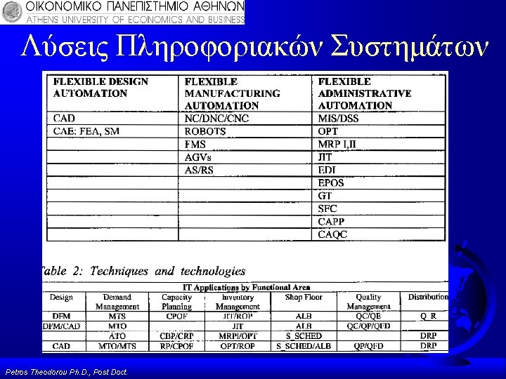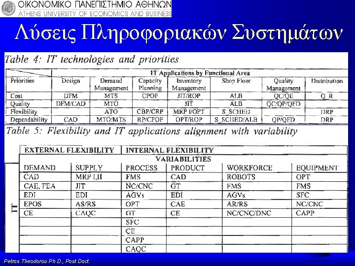 Οργάνωση & Π. Σ Σύνολο Επιχείρησης: ERP, ETRM, Performance Management (PMI’s), Business Intelligence… F Παραγωγή: CAD/CAM/CNC/DNC… F Λογιστήριο: AIS, Γενική Λογιστική, Αναλυτική Λογιστική, Computer Logic DIS, SAS… F Διοίκηση: Excel, Matlab, Solver… F Παραγγελίες/Logistics: MRPI, MRPII… F Πωλήσεις: …. F Για Περισσότερες Πληροφορίες για τα MRP I, II βλέπε Δημοσίευση: *Manthou, V. , Vlachopoulou, M. , & Theodorou P. , 1996, “The Implementation and Use of in Northern Greece”, International Journal of Petros Theodorou Ph. D. , Post Doct. Production Economics V 45, p 187 -193. Material Requirements Planning System