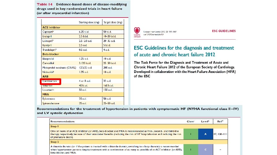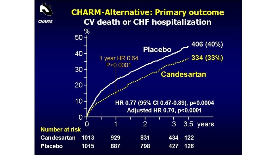 CLINICAL TRIALS OF CANDESARTAN CILEXETIL (1) Target Heart Failure High blood pressure Study Patient population added to standard therapy Treatment added to standard therapy Primary endpoint Benefit CHARM-Added CHF, EF<40% (41 moths) Candesartan + ACEI vs ACEI Reduction in mortality and morbidity Confirmed CHARMAlternative CHF, EF<40%, in tolerant to ACEI (33, 7 months) Candesartan vs placebo Reduction in mortality and hospital admission Confirmed CHARMPreserved CHF, EF >40% (36, 6 months) Candesartan vs placebo Reduction in mortality and hospital admission Moderate confirmed TROPHY Prehypertension (4 years) Candesartan vs placebo Prevention HTN Confirmed Five trials HTN DM (12 -14 weeks) Candesartan vs placebo Treatment HTN Confirmed Candesartan comperative trial HTN+DM (3 months) Candesartan vs telmisartan and valsartan Treatment HTN As good as the other two Candesartan comperative trial HTN and CHF Metaanalysis Candesartan vs losartan Treatment HTN Better, Not costeffective Vascular Health and Risk Management 2011: 7 749– 759