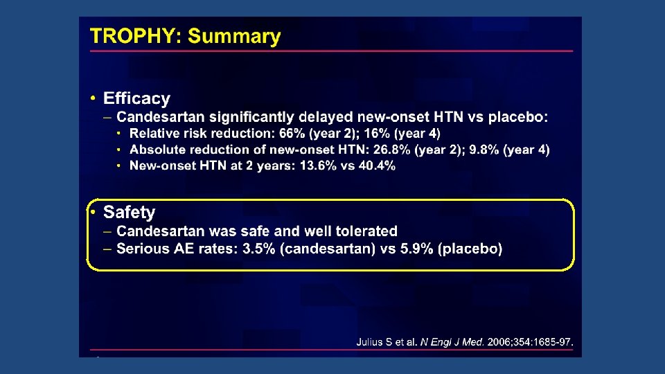 CLINICAL TRIALS OF CANDESARTAN CILEXETIL (2) Target Renal Protection Stroke New-onset diabetes prevention Study Patient population added to standard therapy Treatment added to standard therapy Primary endpoint Benefit SECRET Renal graft + HTN (3 years) Candesartan vs placebo Reduction in mortality and graft failure Confirmed CKD stage 4 -5 and BP < 140/90 mm. Hg (3 years) Candesartan vs placebo Reduction in mortality and hemodialysis Confirmed CKD stage 1 -3, DM, ALB Candesartan vs placebo Reduction in ALB Confirmed SCOPE Aged 70 -89 years, HTN (3, 7 years) Candesartan vs placebo Reduction in stroke and cognitive decline Confirmed for stroke only ACCESS Early stroke, HTN (1 year) Candesartan vs placebo Reduction in mortality and morbidity Confirmed CASE- HTN-obesity Candesartan vs amlodipine Reduction in newonset DM and mortality Confirmed Vascular Health and Risk Management 2011: 7 749– 759