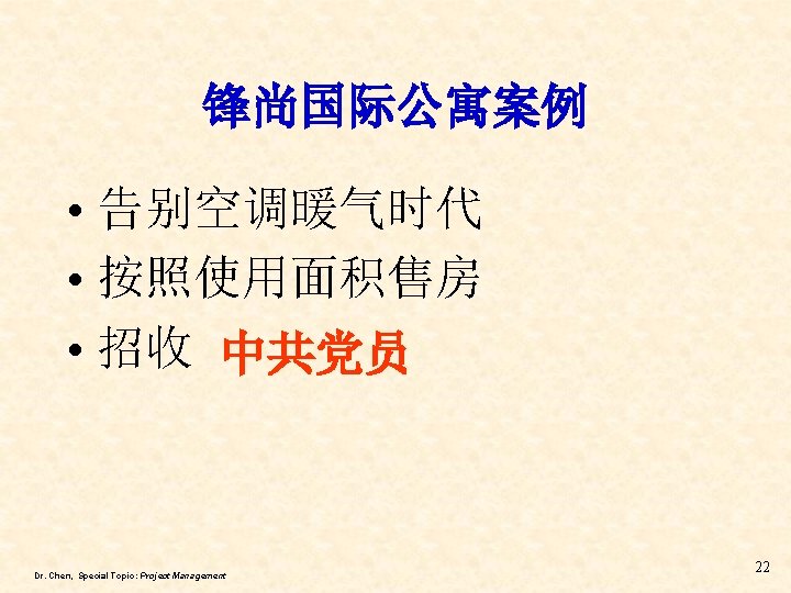 Three … for PM and Enterprise • Three important characteristics for PM and for an enterprise: – 企业家 in English Entrepreneur v Creativity, v Innovation v Entrepreneur Dr. Chen, Special Topic: Project Management