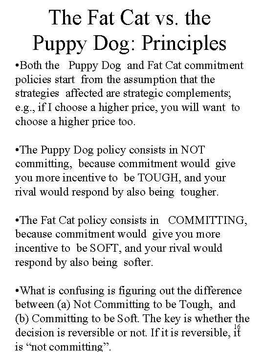 The Fat Cat vs. the Puppy Dog: Principles • Both the Puppy Dog and Fat Cat commitment policies start from the assumption that the strategies affected are strategic complements; e. g. , if I choose a higher price, you will want to choose a higher price too. • The Puppy Dog policy consists in NOT committing, because commitment would give you more incentive to be TOUGH, and your rival would respond by also being tougher. • The Fat Cat policy consists in COMMITTING, because commitment would give you more incentive to be SOFT, and your rival would respond by also being softer. • What is confusing is figuring out the difference between (a) Not Committing to be Tough, and (b) Committing to be Soft. The key is whether the 16 decision is reversible or not. If it is reversible, it is “not committing”.