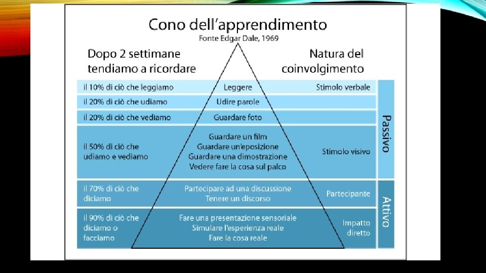 PROPOSTA PER UN METODO DI STUDIO EFFICACE • Comincia con la lettura e il riordino degli appunti presi in aula per riattivare la memoria dei concetti generali • Leggi l’argomento sul libro di testo: parti dall’analisi degli elementi paratestuali (titoli, approfondimenti, sintesi, elementi iconografici, mappe); sottolinea in due fasi, nella prima tutto ciò che aiuta la comprensione, nella seconda (con l’uso di matite colorate) i concetti principali che riletti riattiveranno la memoria dell’argomento appreso • Costruisci una mappa concettuale (sintesi di appunti e informazioni apprese dal libro di testo) • Collega le nuove conoscenze già acquisite (passaggio fondamentale per la rielaborazione personale) • Ripeti a voce alta con l’aiuto della mappa concettuale • Ripeti senza l’aiuto della mappa concettuale: può essere utile registrare la propria performance pe rintracciare, nel riascolto, eventuali punti deboli • Cicli di ripasso per la memorizzazione: un’ora dopo; un giorno dopo; una settimana dopo; un mese dopo.