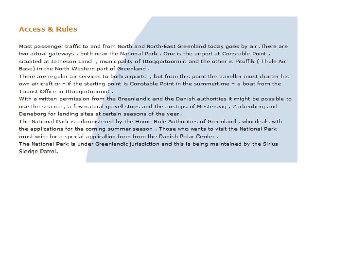 History Originally created on 22 May 1974 from the northern, practically uninhabited part of the former Ittoqqortoormiit Municipality in Tunu (East Greenland), the park was expanded by another 272, 000 km² to its present size in 1988, by including the northeastern part of the former county of Avannaa (North Greenland). In January 1977 it was designated an international biosphere reserve. It is overseen by the Greenland Department of Environment and Nature. The historical research camps on the ice sheet, Eismitte and North Ice, fall within the boundaries of the present-day park. Population The park has virtually no permanent human population. In 1986, the permanent population of the park was 40, living at Mesters Vig although 400 sites saw occasional summertime use. These 40 were involved in cleanup and closeout operations at mining exploration sites and soon left. Recently only 31 people and about 110 dogs were present over winter in North East Greenland, distributed among the following stations (all on the coast, except Summit Camp): Daneborg (12) headquarters of the Sirius Patrol, the park policing agency Danmarkshavn (8) civilian weather station Station Nord (5) military base Mestersvig (2) military outpost with 1, 800 m gravel runway Zackenberg (0) summer-only research station Summit Camp (4) research station on the Greenland Ice Sheet During summer scientists add to this. The research station ZERO (Zackenberg Ecological Research Operations) can cater for over 20 scientists and station personnel.