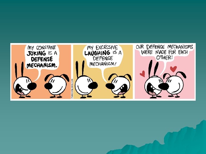DENIAL u. Refusal reality Example: Carol’s dog, that she has had since she was a small child, has died. She refuses to accept the dogs death and continues to act as if the dog is still alive. to accept