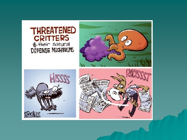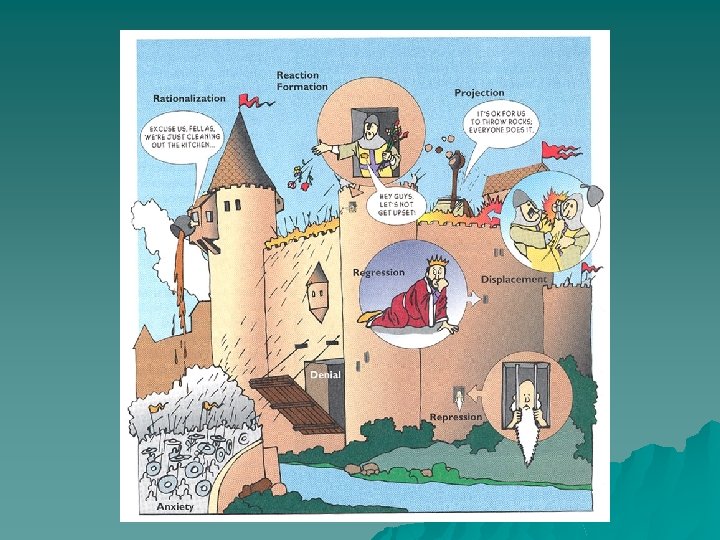 PROJECTION u An attempt to protect one’s self – esteem by blaming unpleasant feelings or inappropriate actions on others. u Example: Getting a bad grade and blaming it on the teacher’s dislike for you. u Evading personal responsibility.