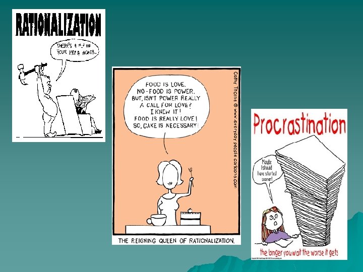 RATIONALIZATION u u Attempting to justify one’s actions with an excuse rather than by admitting one’s failure or mistake. Example: Anne justifies flunking her math test because she was absent the day it was scheduled.