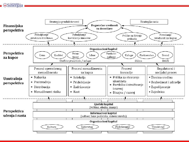 Interna perspektiva Operativni procesi su primarne aktivnosti iz Porterovog lanca vrednosti. Operativni procesi uključuju dobijanje sirovih materijala od dobavljača, stvaranje gotovog proizvoda, dostavljanje proizvoda kupcima i upravljanje rizikom. Povezanost strategije i operacija zahteva sveobuhvatan okvir koji integriše planiranje prodaje i proizvodnje, alokaciju resursa, dinamičko predviđanje (budžeta) poslovnih i kapitalnih rashoda (OPEX – rashodi za zaposlene i korišćenje opreme i objekata; CAPEX – povećanje kapaciteta opreme i tehnologije) i finansijsko predviđanje profitabilnosti. Masovna proizvodnja i isporuka standardnih proizvoda i usluga mora se zameniti fleksibilnom, dinamičnom i visokokvalitetnom isporukom inovativnih proizvoda i usluga koji se mogu individualizovati za ciljane segmente kupaca.