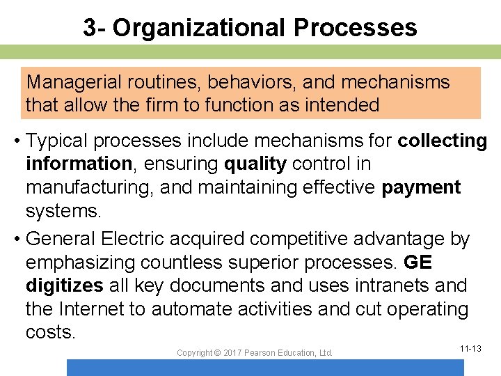 3 - Organizational Processes Managerial routines, behaviors, and mechanisms that allow the firm to function as intended • Typical processes include mechanisms for collecting information, ensuring quality control in manufacturing, and maintaining effective payment systems. • General Electric acquired competitive advantage by emphasizing countless superior processes. GE digitizes all key documents and uses intranets and the Internet to automate activities and cut operating costs. Copyright © 2017 Pearson Education, Ltd. 11 -13