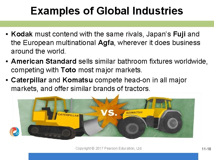 Examples of Global Industries • Kodak must contend with the same rivals, Japan’s Fuji and the European multinational Agfa, wherever it does business around the world. • American Standard sells similar bathroom fixtures worldwide, competing with Toto most major markets. • Caterpillar and Komatsu compete head-on in all major markets, and offer similar brands of tractors. Copyright © 2017 Pearson Education, Ltd. 11 -18