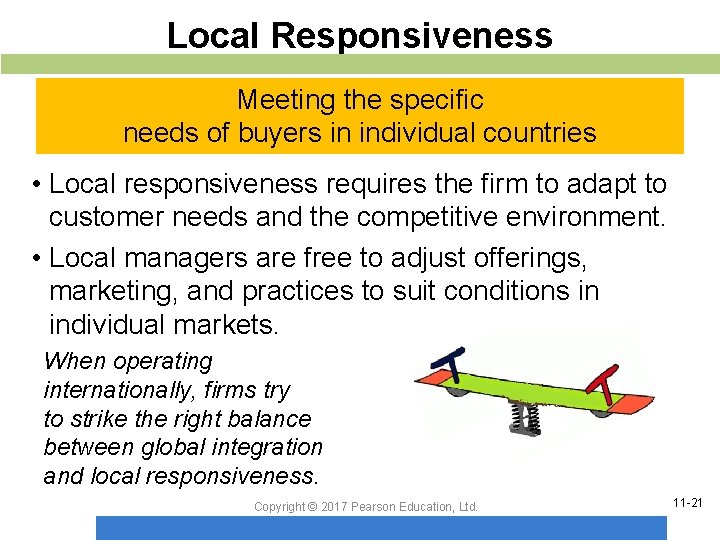 Local Responsiveness Meeting the specific needs of buyers in individual countries • Local responsiveness requires the firm to adapt to customer needs and the competitive environment. • Local managers are free to adjust offerings, marketing, and practices to suit conditions in individual markets. When operating internationally, firms try to strike the right balance between global integration and local responsiveness. Copyright © 2017 Pearson Education, Ltd. 11 -21