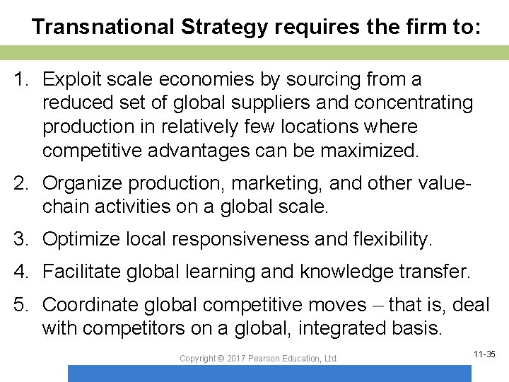 Transnational Strategy requires the firm to: 1. Exploit scale economies by sourcing from a reduced set of global suppliers and concentrating production in relatively few locations where competitive advantages can be maximized. 2. Organize production, marketing, and other valuechain activities on a global scale. 3. Optimize local responsiveness and flexibility. 4. Facilitate global learning and knowledge transfer. 5. Coordinate global competitive moves – that is, deal with competitors on a global, integrated basis. Copyright © 2017 Pearson Education, Ltd. 11 -35