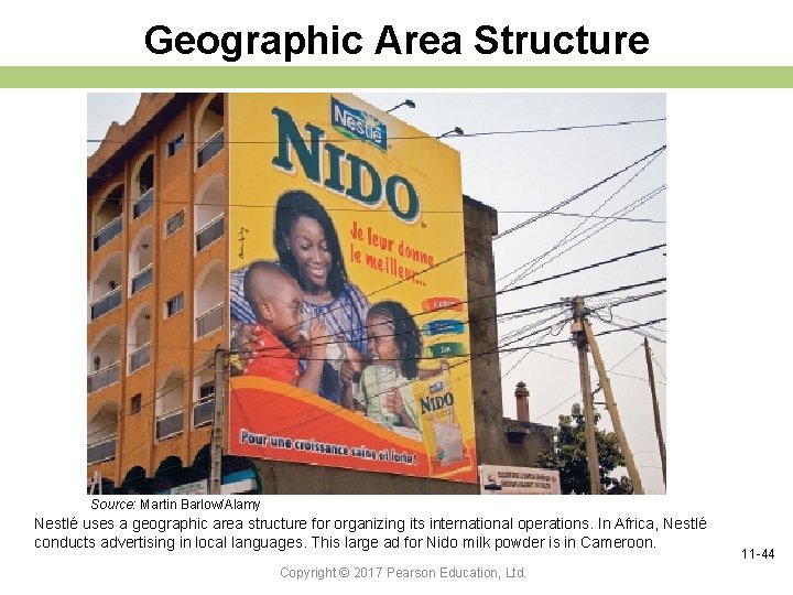 Geographic Area Structure Source: Martin Barlow/Alamy Nestlé uses a geographic area structure for organizing its international operations. In Africa, Nestlé conducts advertising in local languages. This large ad for Nido milk powder is in Cameroon. Copyright © 2017 Pearson Education, Ltd. 11 -44