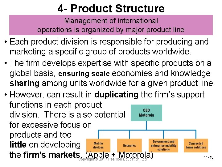 4 - Product Structure Management of international operations is organized by major product line • Each product division is responsible for producing and marketing a specific group of products worldwide. • The firm develops expertise with specific products on a global basis, ensuring scale economies and knowledge sharing among units worldwide for a given product line. • However, can result in duplicating the firm’s support functions in each product division. There is also potential for excessive focus on products and too little on developing the firm’s markets. (Apple + Motorola) 11 -45 Copyright © 2017 Pearson Education, Ltd.