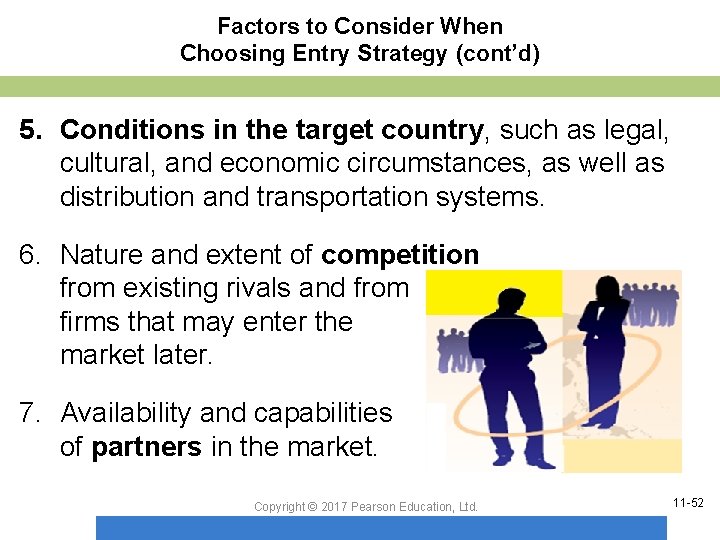 Factors to Consider When Choosing Entry Strategy (cont’d) 5. Conditions in the target country, such as legal, cultural, and economic circumstances, as well as distribution and transportation systems. 6. Nature and extent of competition from existing rivals and from firms that may enter the market later. 7. Availability and capabilities of partners in the market. Copyright © 2017 Pearson Education, Ltd. 11 -52