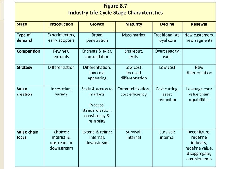 Industry Stages �Introduction – innovative new companies �Growth – increased demand, standardization �Maturity – slowed demand, commoditization �Decline – substitutes abound �Renewal – new customers, new segments § Redefine industry boundaries § Disaggregate bocks of value chain activity
