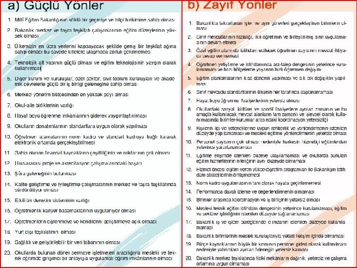 Üst Politika Belgeleri 1) Kalkınma Planı ve Eğitim Özel İhtisas Komisyon Raporu 2) Orta Vadeli Program 3) AB Müktesebatına Uyum Programı 4) TUBİTAK Vizyon 2023 Eğitim ve İnsan Kaynakları Raporu 5) MEB Sürekli Kurum Geliştirme Projesi, TÜSSİDE Sonuç Raporu 6) Bilgi Toplumu Stratejisi 7) Millî Eğitim Strateji Belgesi 8) Kamu Kurum ve Kuruluşları İçin Stratejik Planlama Kılavuzu (DPT) 9) MEB Stratejik Plan Hazırlık Programı 10)MEB Stratejik Plan Durum Analizi Raporu 11)Hükümet Programı 12)Hükümet Eylem Planı 13)MEB Bütçe Raporu 14)Millî eğitim ile ilgili mevzuat 19