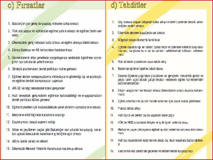 Çevre Analizi Kuruluşun kontrolü dışında olan ancak kuruluş için kritik olabilecek dışsal değişim ve eğilimlerin fırsat ve tehditler olarak incelenmesidir. Fırsatlar, kuruluş için avantaj sağlayacağı, tehditlerin ise kuruluş için olumsuz etkiler oluşturabileceği düşünülür. Her ikisi de kuruluşun kontrolü dışında olan etken yada durumlardır. Analiz kapsamında ekonomik, sosyal, siyasal, demografik, kültürel, çevresel, teknolojik ve rekabete yönelik etkenlerin incelenmesi gerekir. 35