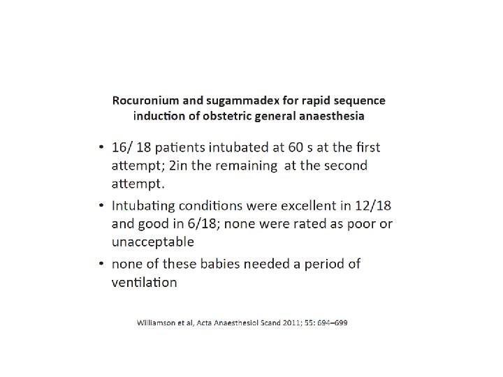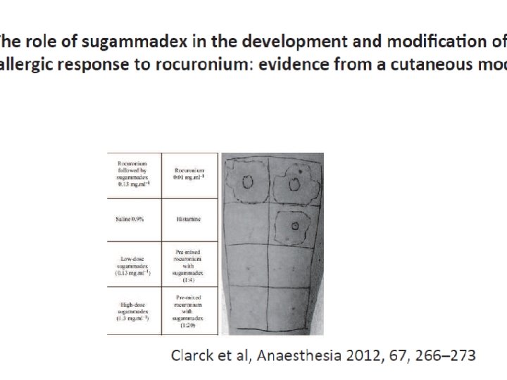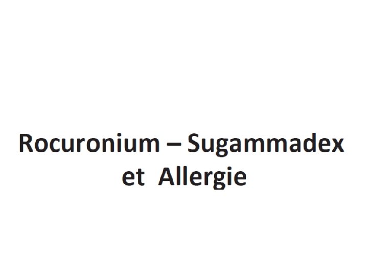 Situation particulière Allergie • Plusieurs cas de traitement de choc anaphylactique au rocuronium par administration de suggamadex. • Etudes en laboratoires d’allergologie: pas de confirmation • Hypothèse: Amélioration hémodynamique en rapport avec une récupération de tonicité musculaire digestive et thoracique