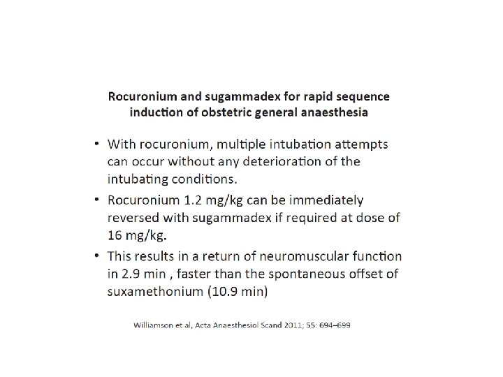 Situation particulière Obèse IMC > 40 Succinylcholine poids réel Curare non dépolarisant: masse maigre Sugammadex masse maigre Eviter néostigmine car délai d’action allongé et risque de recurarisation. • Indication favorable a l’association esmeron/ Sugammadex • • NB: Masse maigre: • Formule de Janmahasatian • ou poids ideal =Taille -100 + 20%