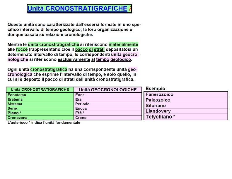 Con la Biostratigrafia si definiscono le unità cronostratigrafiche, cioè le suddivisioni relative del tempo geologico. Unità cronostratigrafiche: Eratemi (eg, Mesozoico); Sistemi (eg, Triassico); Serie (eg, Carnico); Piani (eg, Tuvalico) Unità temporali Ere (eg, Mesozoico); Periodi (eg, Triassico); Epoche (eg, Carnico); Età (eg, Tuvalico);