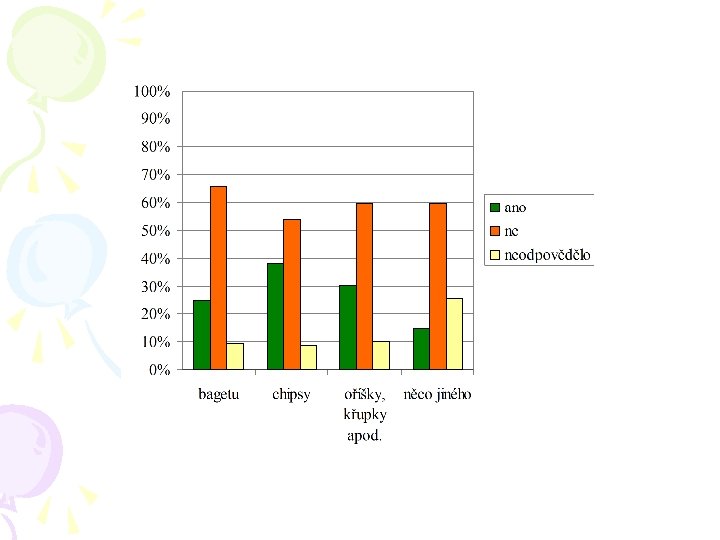 AUTOMAT VE ŠKOLE Kupuji si v automatu ve škole Ano sladkosti čokolády sušenky, oplatky bonbony různé plněné čok. tyčinky na pití sladkou limonádu - colu, sprite, mirindu, 7 UP…. minerálku vodu kávu čokoládu (tekutou) čaj mléko na jídlo jogurt bagetu chipsy slané tyčinky, oříšky apod. něco jiného - napiš co Ne Někdy