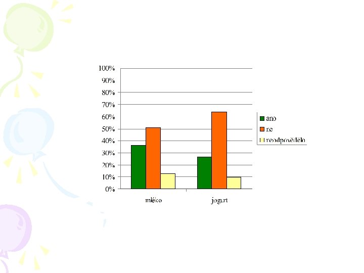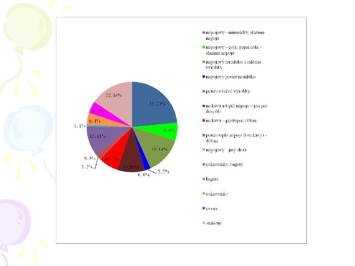 Přehled nejčastěji konzumovaných pokrmů • • • • Snídaně: bílé pečivo s máslem, sýrem, marmeládou, šunkou sladké pečivo lupínky, cereálie jogurt chléb s pomazánkou Obědy: kuře na různý způsob řízky omáčky s knedlíkem – svíčková špagety a těstoviny Večeře: studené – pečivo s uzeninou, ovoce, zelenina, jogurt pizza špagety vajíčka topinky, toasty