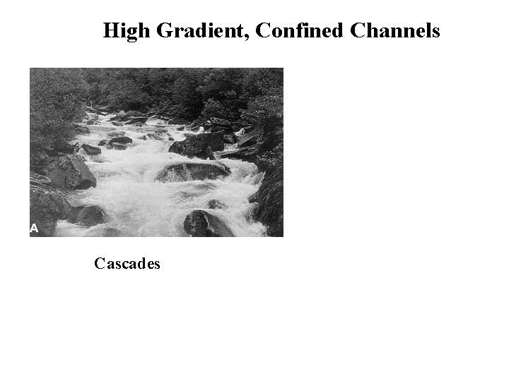High Gradient, Confined Channels Poorly organized cobble and boulder bed Tumbling flow over large, protruding grains gradient ≥ 7% Cascades