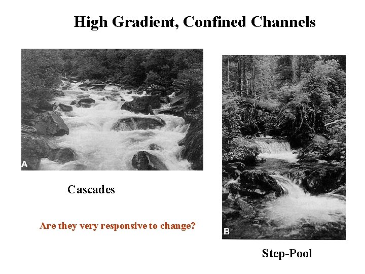 High Gradient, Confined Channels Cascades Are they very responsive to change? How / where do organisms seek refuge during flood events? Step-Pool