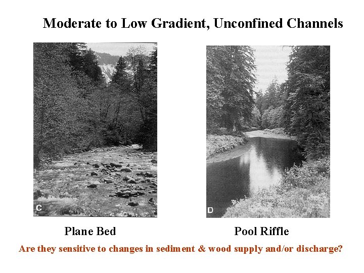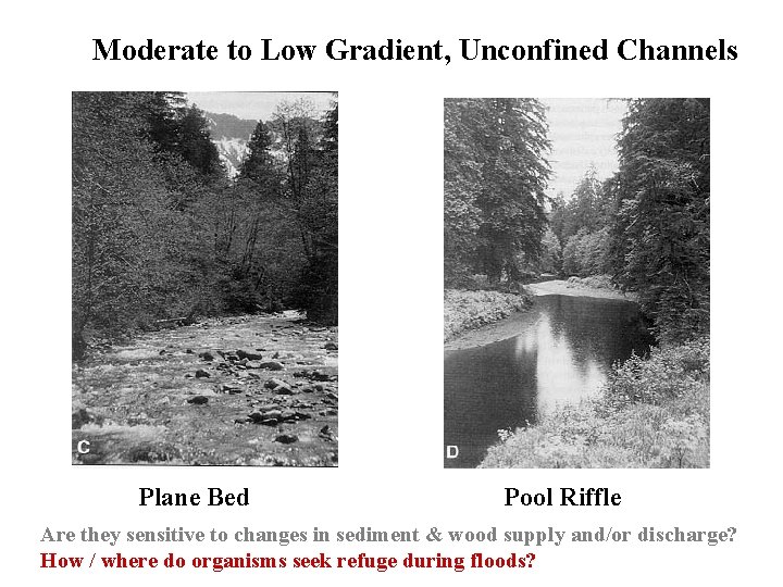 Moderate to Low Gradient, Unconfined Channels Plane Bed Pool Riffle Are they sensitive to changes in sediment & wood supply and/or discharge? How / where do organisms seek refuge during floods?