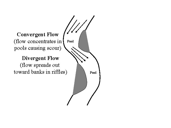 Convergent Flow (flow concentrates in pools causing scour) Divergent Flow (flow spreads out toward banks in riffles) Pool
