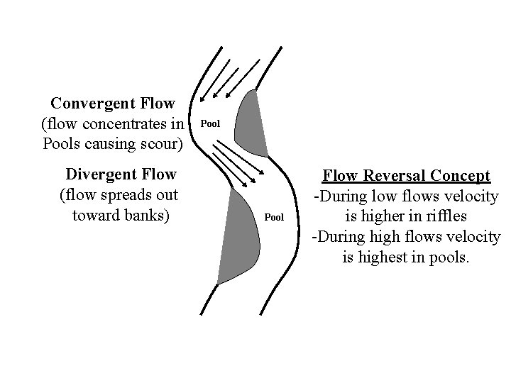 Convergent Flow (flow concentrates in Pools causing scour) Divergent Flow (flow spreads out toward banks) Pool Flow Reversal Concept -During low flows velocity is higher in riffles -During high flows velocity is highest in pools.