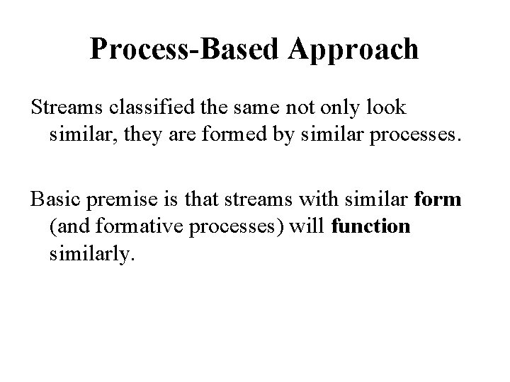 Process-Based Approach Streams classified the same not only look similar, they are formed by similar processes. Basic premise is that streams with similar form (and formative processes) will function similarly.