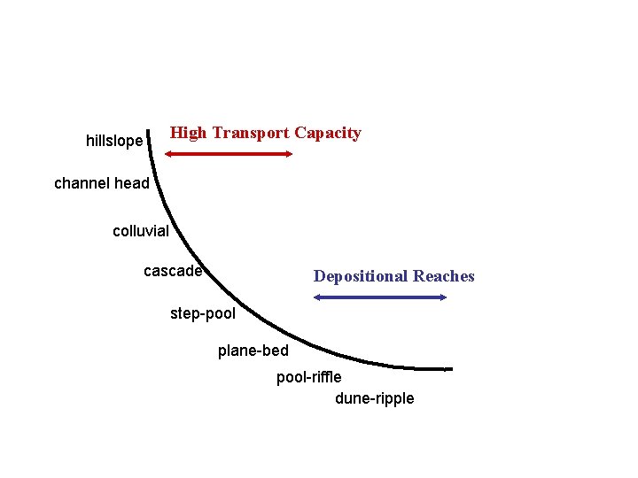 hillslope High Transport Capacity channel head colluvial cascade Depositional Reaches step-pool plane-bed pool-riffle dune-ripple Montgomery and Buffington, 1997