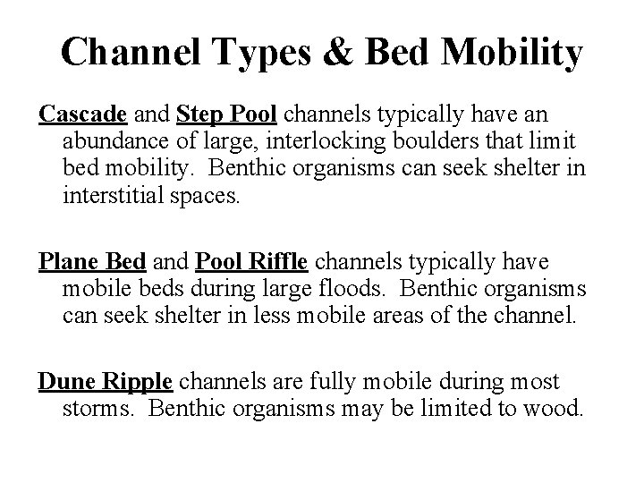 Channel Types & Bed Mobility Cascade and Step Pool channels typically have an abundance of large, interlocking boulders that limit bed mobility. Benthic organisms can seek shelter in interstitial spaces. Plane Bed and Pool Riffle channels typically have mobile beds during large floods. Benthic organisms can seek shelter in less mobile areas of the channel. Dune Ripple channels are fully mobile during most storms. Benthic organisms may be limited to wood.