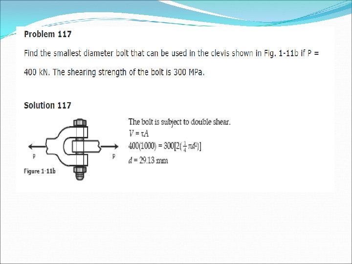 Example A hollow steel tube with an inside diameter of 100 mm must carry a tensile load of 400 k. N. Determine the outside diameter of the tube if the stress is limited to 120 MN/m 2. Solution