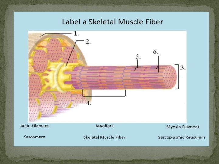 Number the following cylindrical structures in order from largest(1) to smallest(5) *Myofibril *Fascicle *Myofilaments *Muscle fibre *muscle