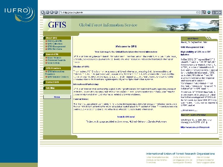 Enhancing stakeholder innovation capacity – contribution by IUFRO Information Management Global Forest Information Service (GFIS) • Internet gateway to forest information resources from around the world • Enhance access to and provision of quality forest-related information • Initiative of the Collaborative Partnership on Forests (CPF) • Main Partners: CABI, CIFOR, FAO and IUFRO
