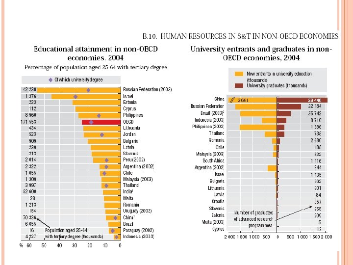 SOME DATA ABOUT S&T (7) In terms of strength of the tertiary education: Russia leads with 55% of the total population aged 25 to 64 having a tertiary degree, well above the OECD average of 28% while Slovenia places itself at 18%