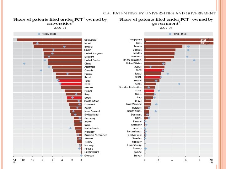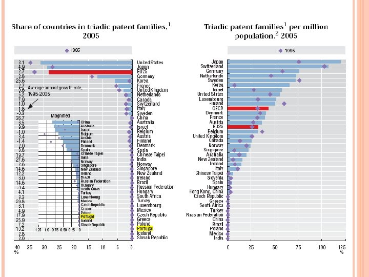 PATENTS (2) Patent filings by residents per Million Dollars spent in R&D: world average 0. 81, ranging from S. Korea 4. 60 - Japan 3. 49 - Belarus 3. 15 - Russian Federation 1. 46 – Ukraine 1. 42 - Germany 0. 92 China 0. 78 - USA 0. 71 - India 0. 23 - Mexico 0. 14 – Belgium 0. 08 - Portugal 0. 07