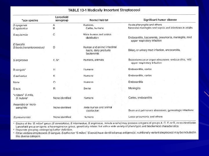 Serology: Lanciefield Classification Streptococci Lanciefield classification Group A S. pyogenes Group B S. agalactiae Group C S. equisimitis Group D Enterococcus Other groups (E-U) Streptococci classified into many groups from A-K & H-V One or more species per group Classification based on C- carbohydrate antigen of cell wall – Groupable streptococci A, B and D (more frequent) C, G and F (Less frequent) – Non-groupable streptococci S. pneumoniae (pneumonia) viridans streptococci – e. g. S. mutans – Causing dental carries