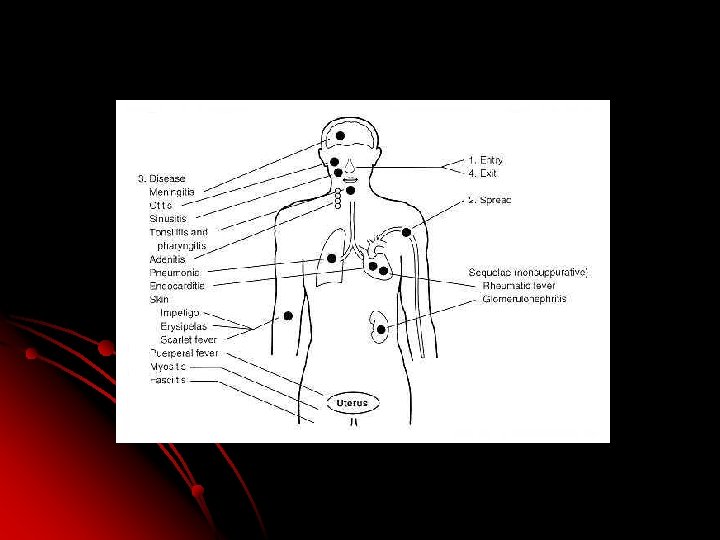 Epidemiologia • • l l Patógeno bacteriano más frecuente. Los grupos A, B, C, D y G Mayor riesgo en niños de 5 -15 años (extremo de edades) Son parte de poblacion normal en orofaringe Mas comun f-invierno y p-de primavera Se propaga de persona a persona, alimentos, y fomites Se puede encontrar en bases militares y en escuelas Se disemina por contacto directo interpersonal Gotitas de flugge Fisuras o abrasiones en la piel