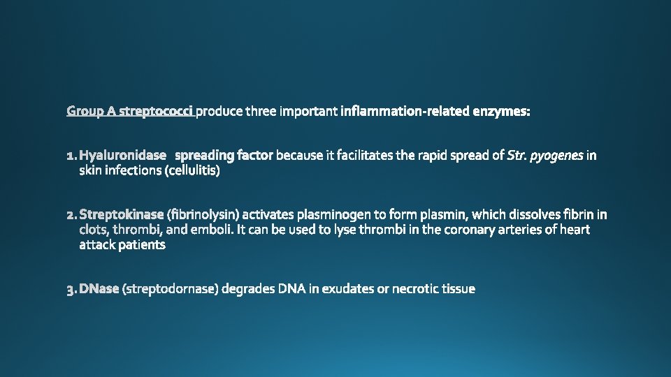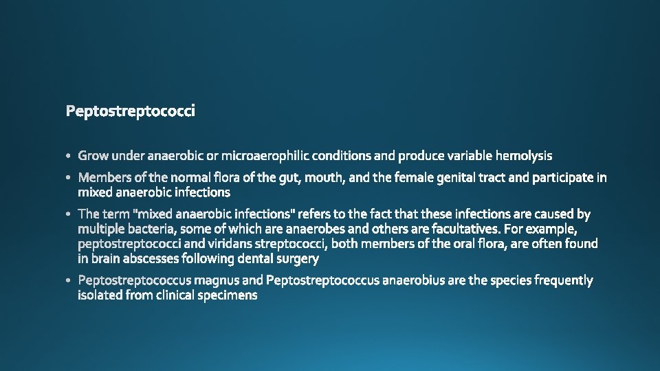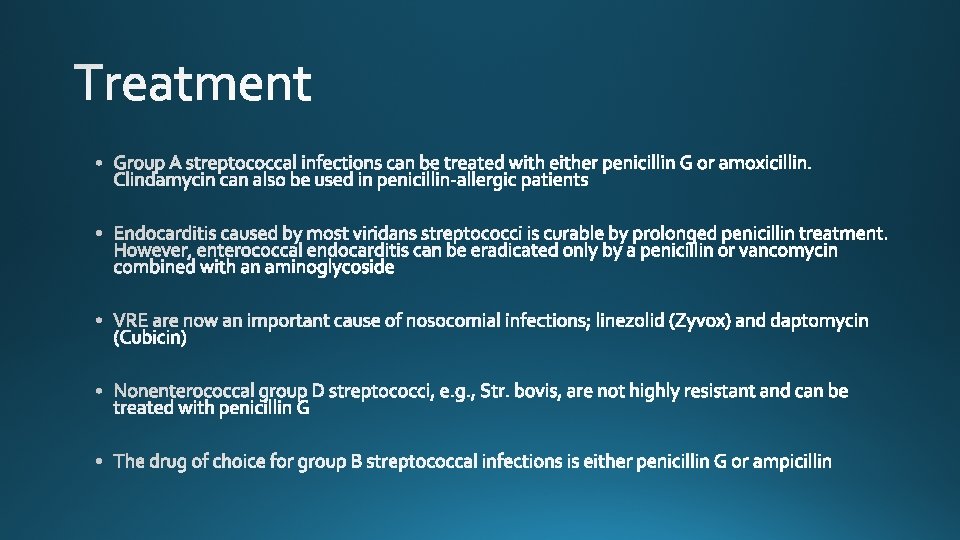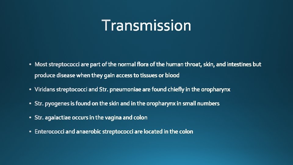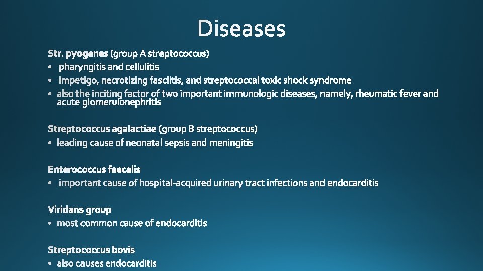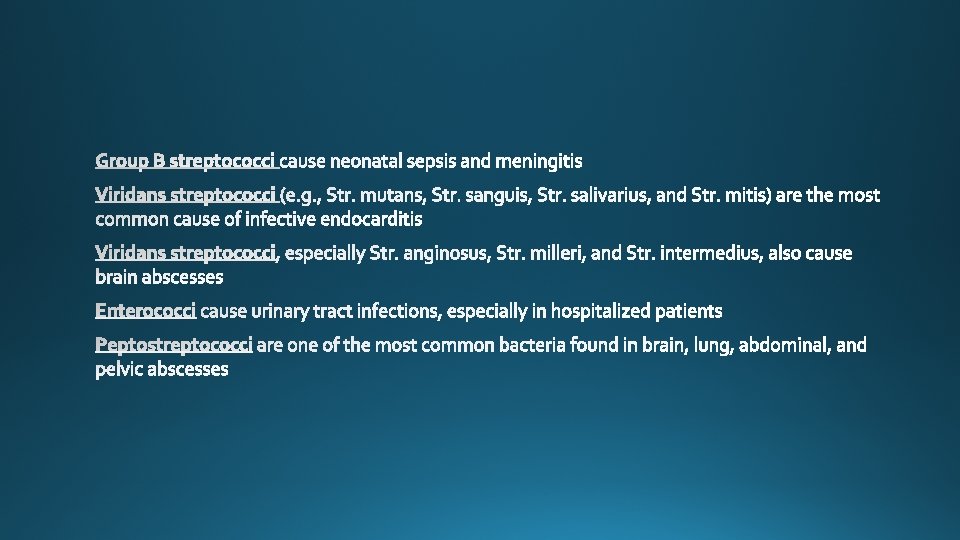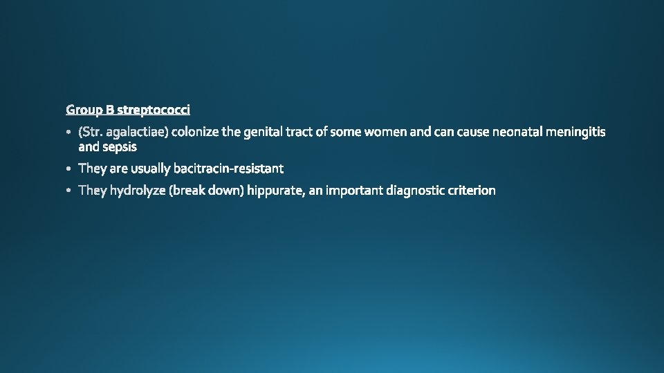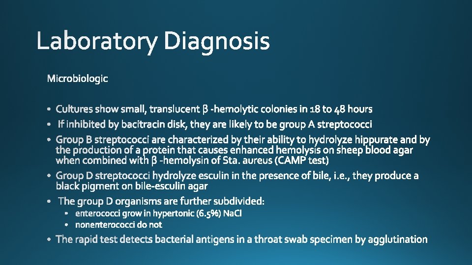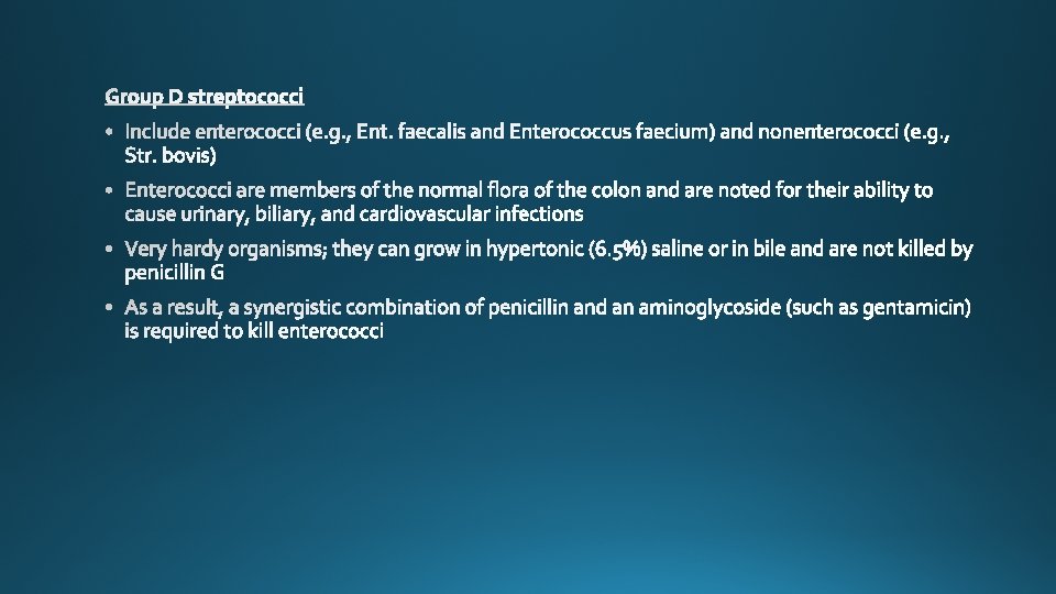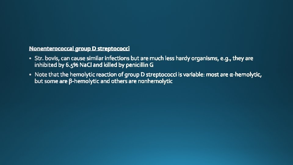 Species Lancefield Group Typical Hemolysis Diagnostic Features Str. pyogenes A Beta Bacitracin-sensitive Str. agalactiae B Beta Bacitracin-resistant; hippurate hydrolyzed Ent. faecalis D Alpha or beta or none Growth in 6. 5% Na. Cl Str. bovis D Alpha or none No growth in 6. 5% Na. Cl Str. pneumoniae NA Alpha Bile-soluble; inhibited by optochin Viridans group NA Alpha Not bile-soluble; not inhibited by optochin