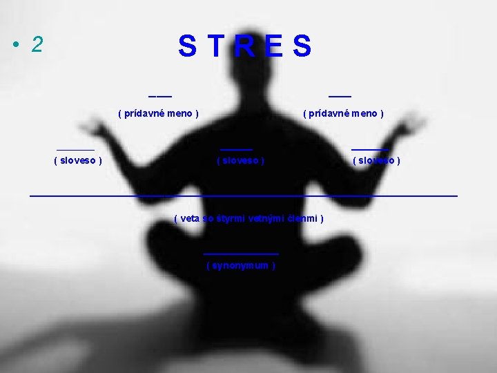 STRES • je nie je - reakcia organizmu na jeho potreby a požiadavky - stav silného fyziologického a psychologického napätia - príprava na útok alebo útek - počiatok mnohých ochorení - nevyhnutne zlý, pretože niekedy človeku pomôže dosiahnuť vytúžený cieľ - úzkosť - strach - priama príčina choroby, hoci sa často podieľa na jej vzniku a rozvoji